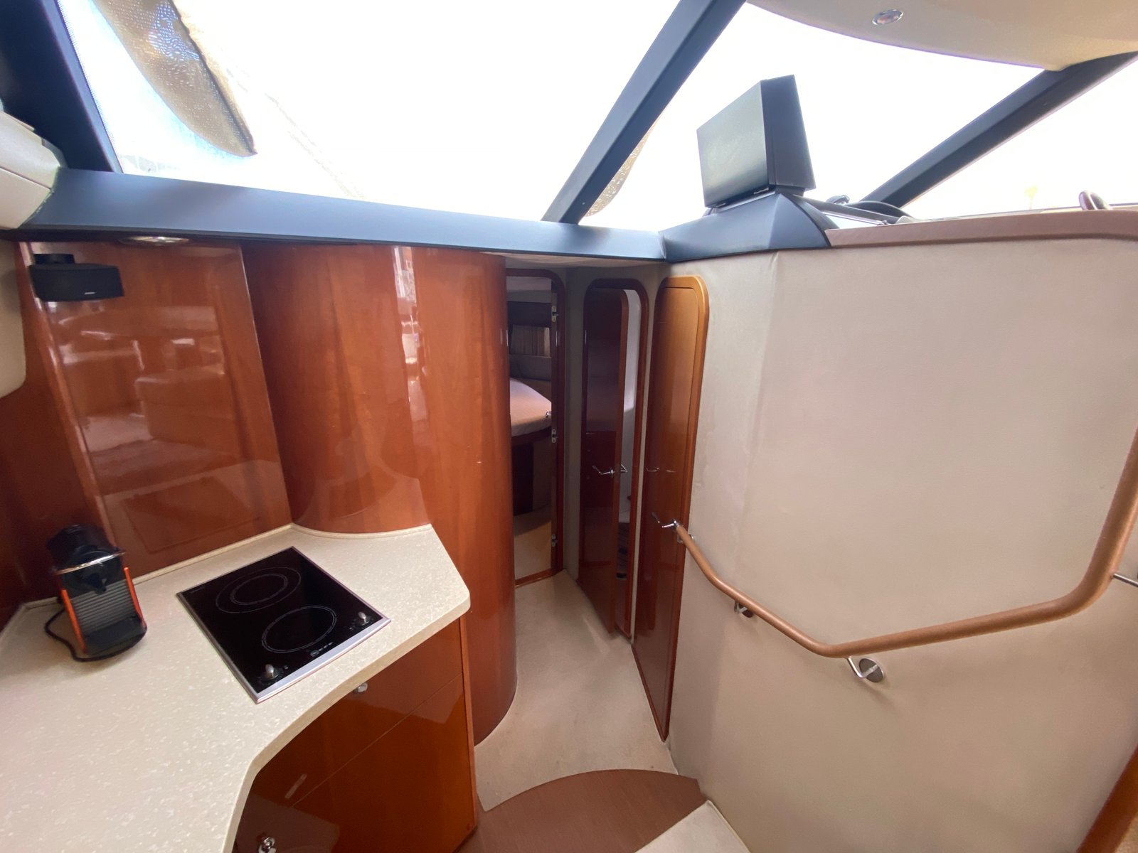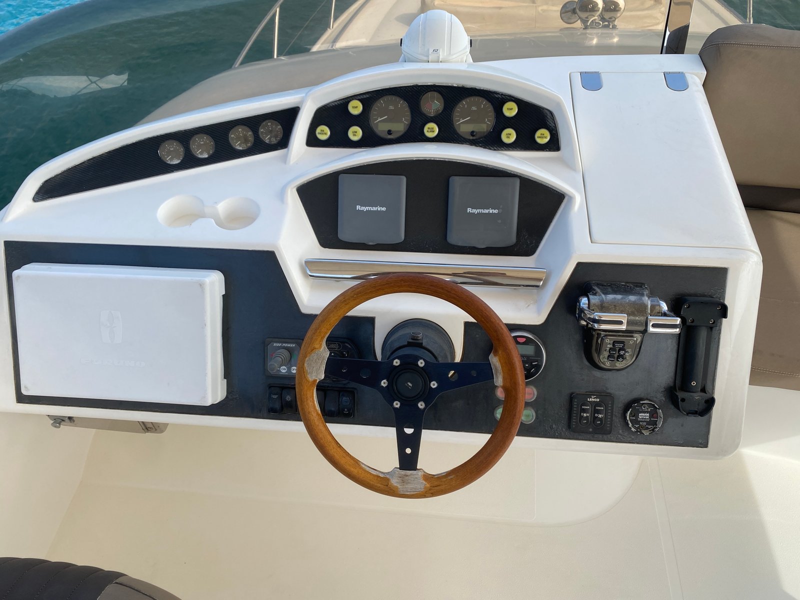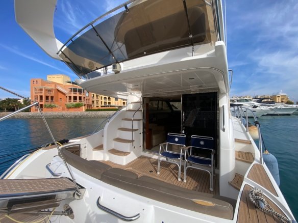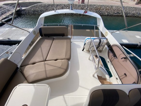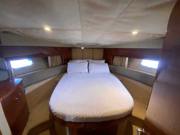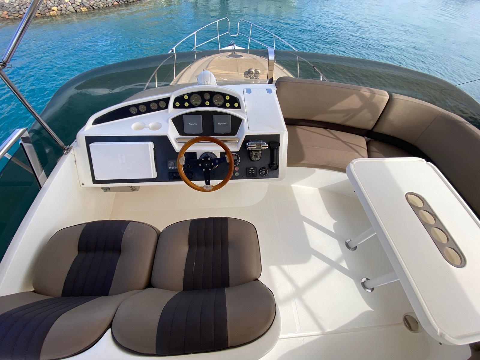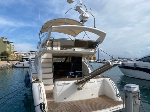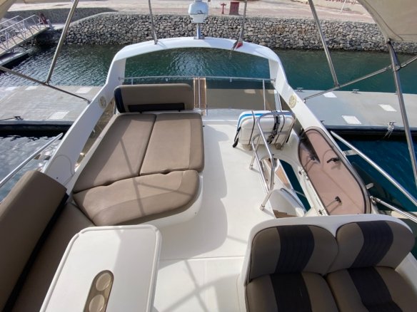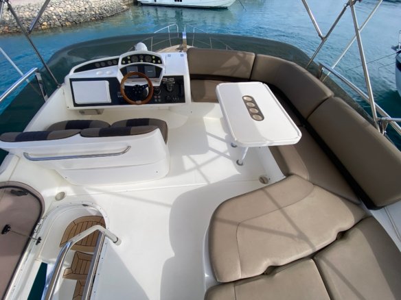 The Princess 42 Fly is a two cabin family cruiser with overnight capability. It is powered bye twin CAT engines, has a water maker and tender lifting passarelle.